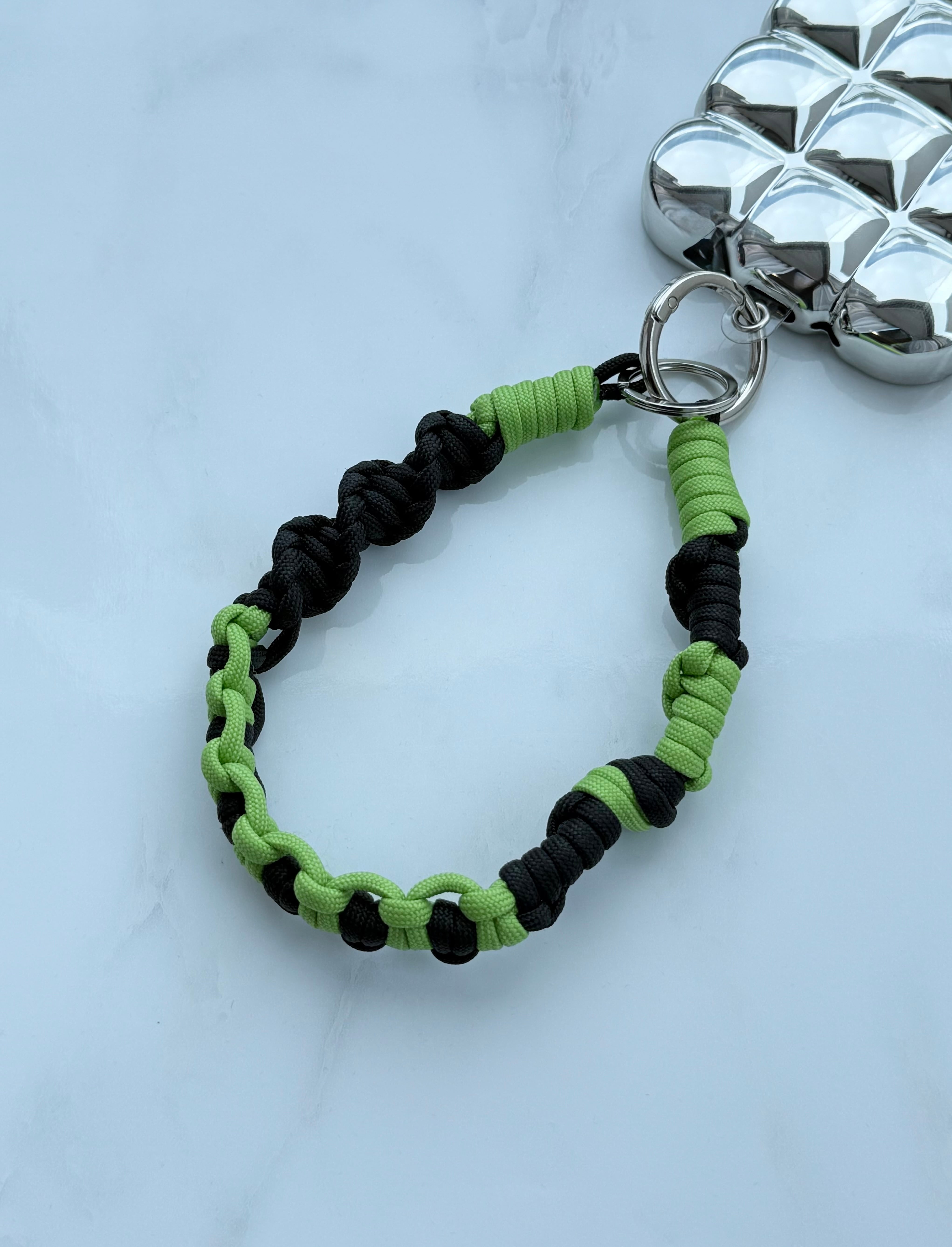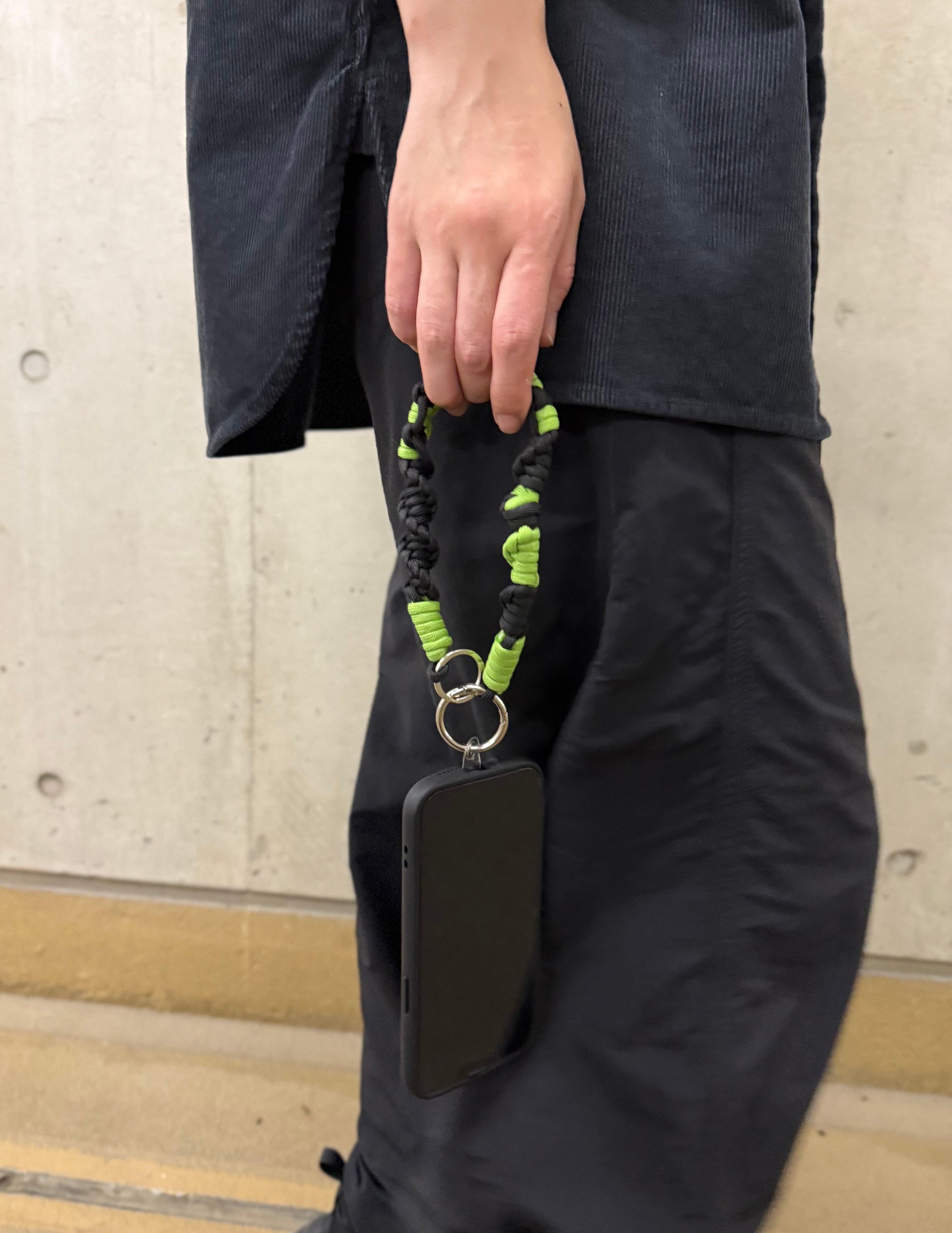 深みのあるブラックをベースに、鮮やかな黄緑を織り交ぜたハンドメイドストラップ。